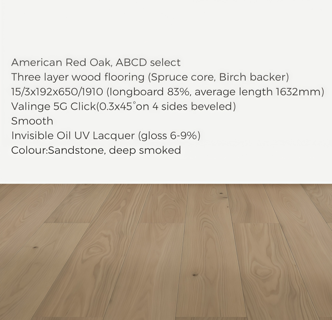# Three layer 15/3x192x1910 5G Click # American Red Oak, ABCD select # Smooth # Deep smoked Invisible Oil UV Lacquer
