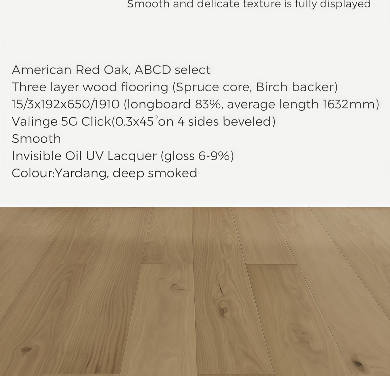 # Three layer 15/3x192x1910 5G Click # American Red Oak, ABCD select # Smooth # Deep smoked Invisible Oil UV Lacquer