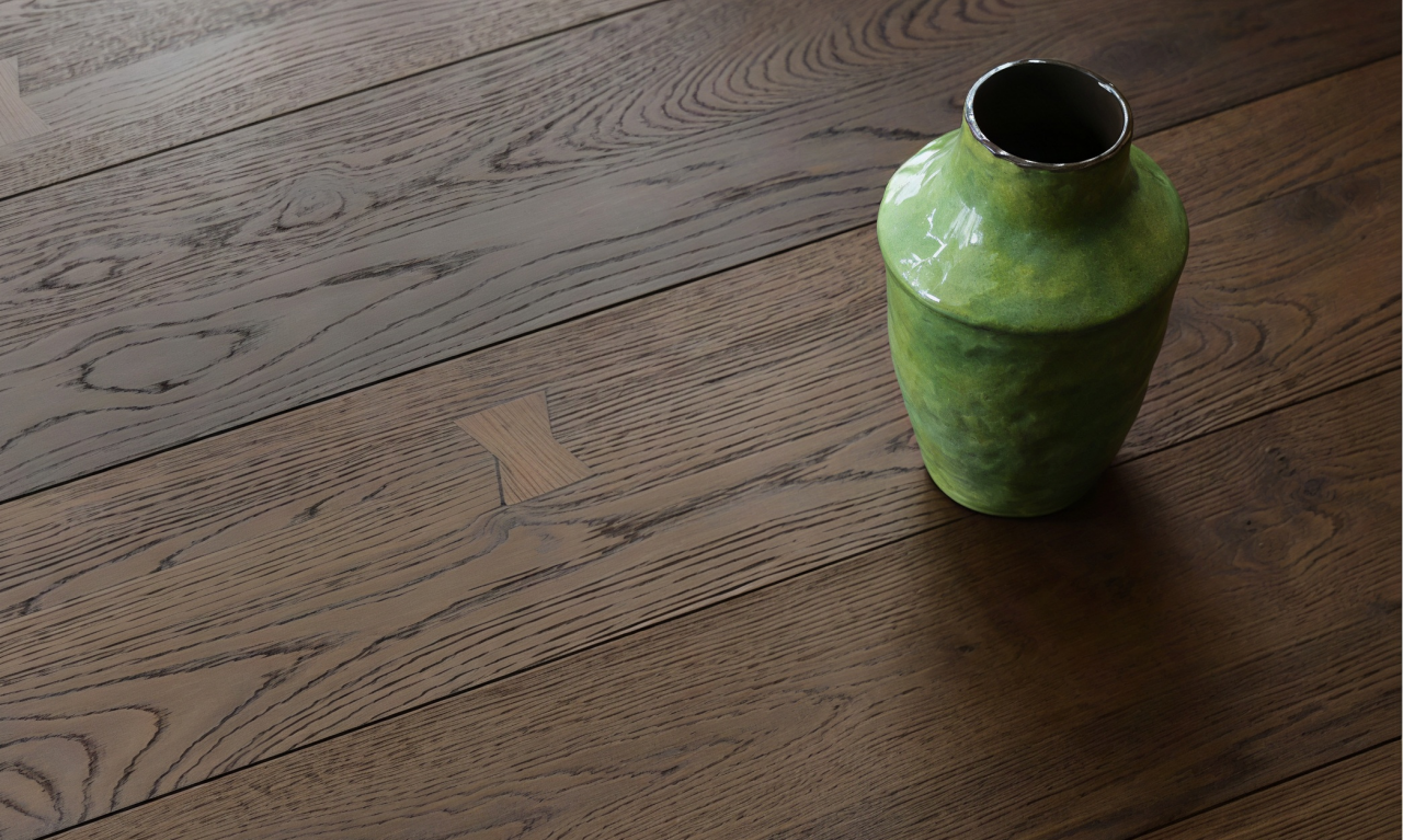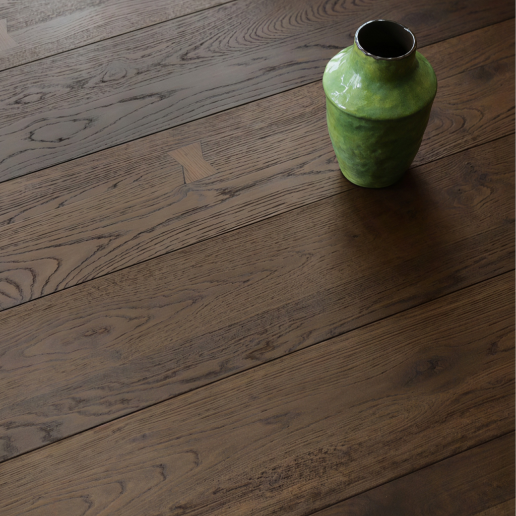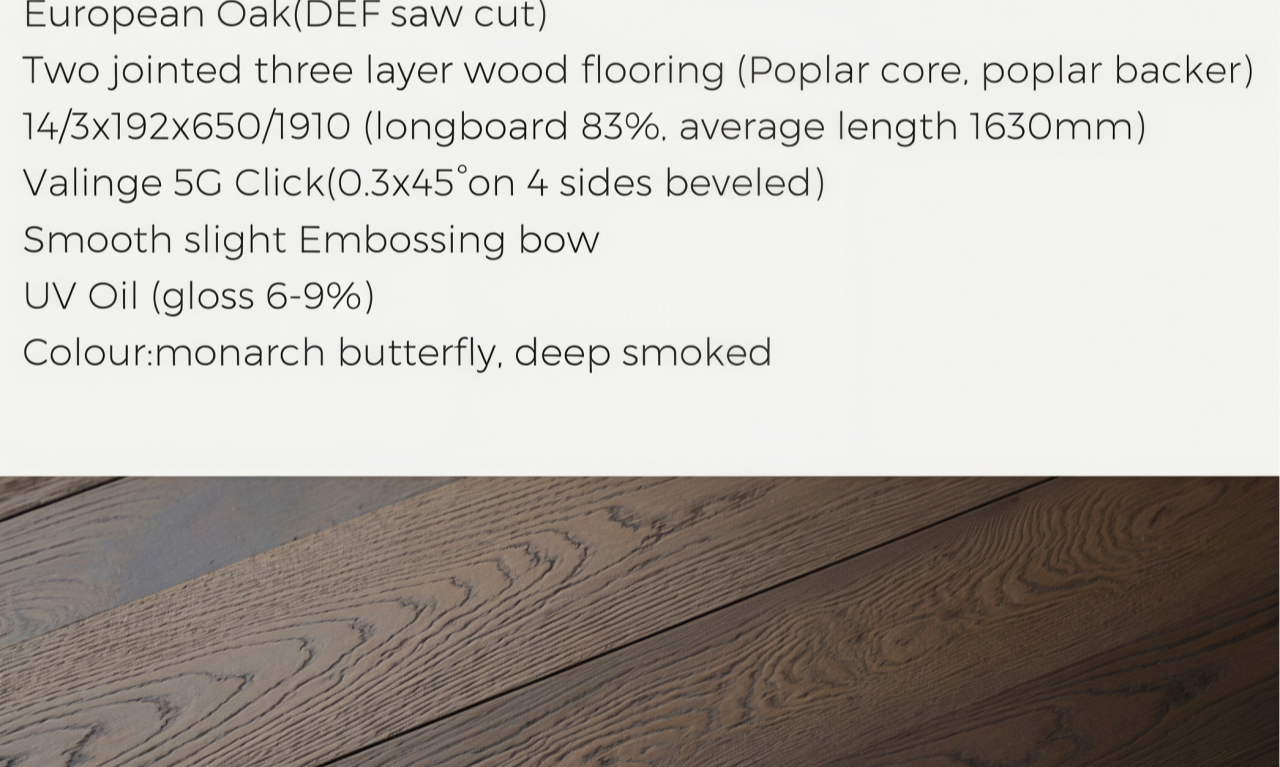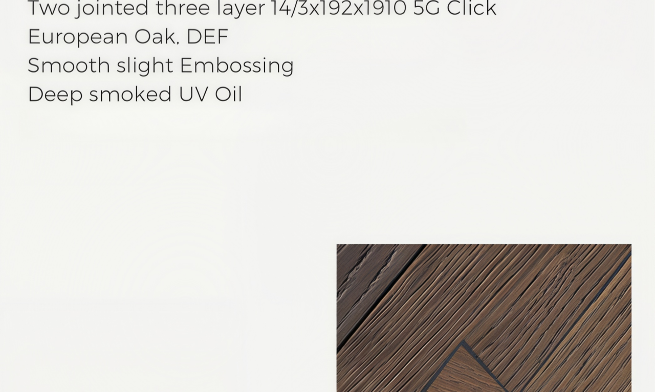 # Two jointed three layer 14/3x192x1910 5G Click # European Oak, DEF # Smooth slight Embossing # Deep smoked UV Oil