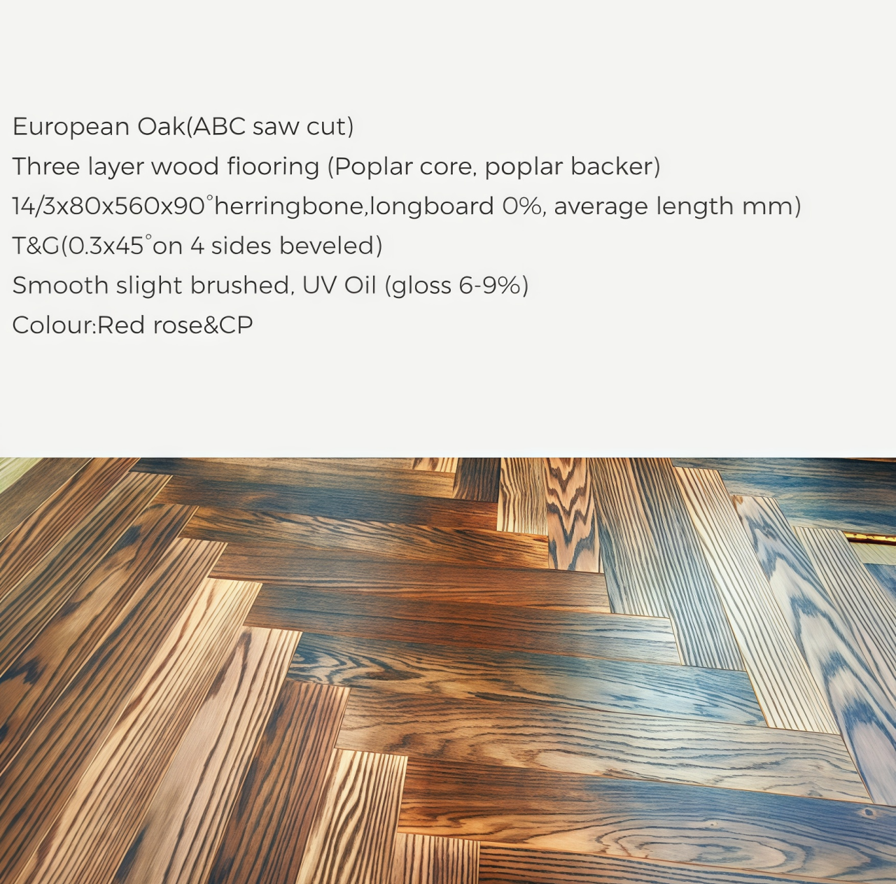 # Three layer 14/3x80x560x90° T&G # European Oak, ABC # Smooth slight brushed # UV lacquer